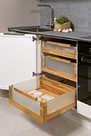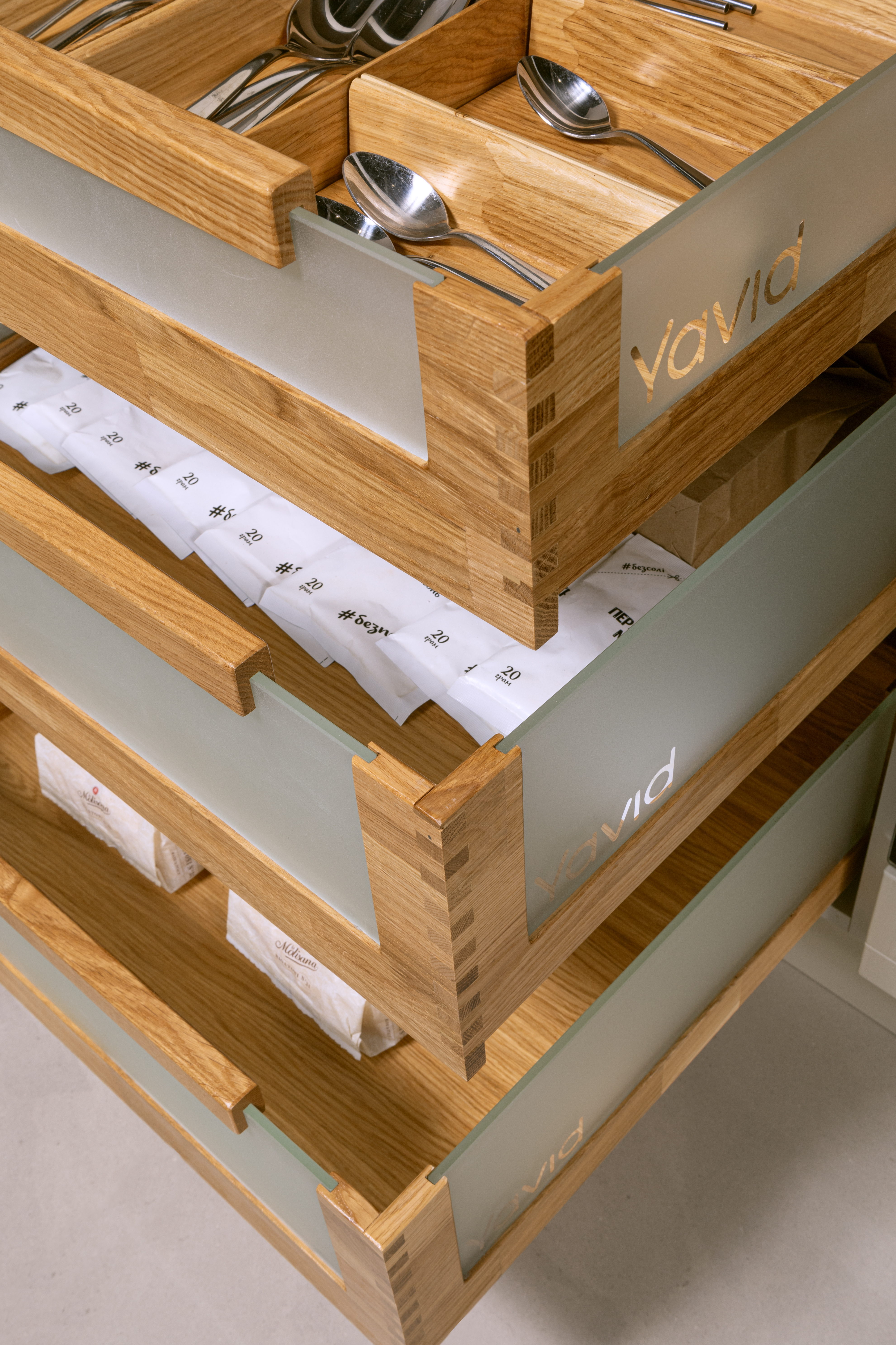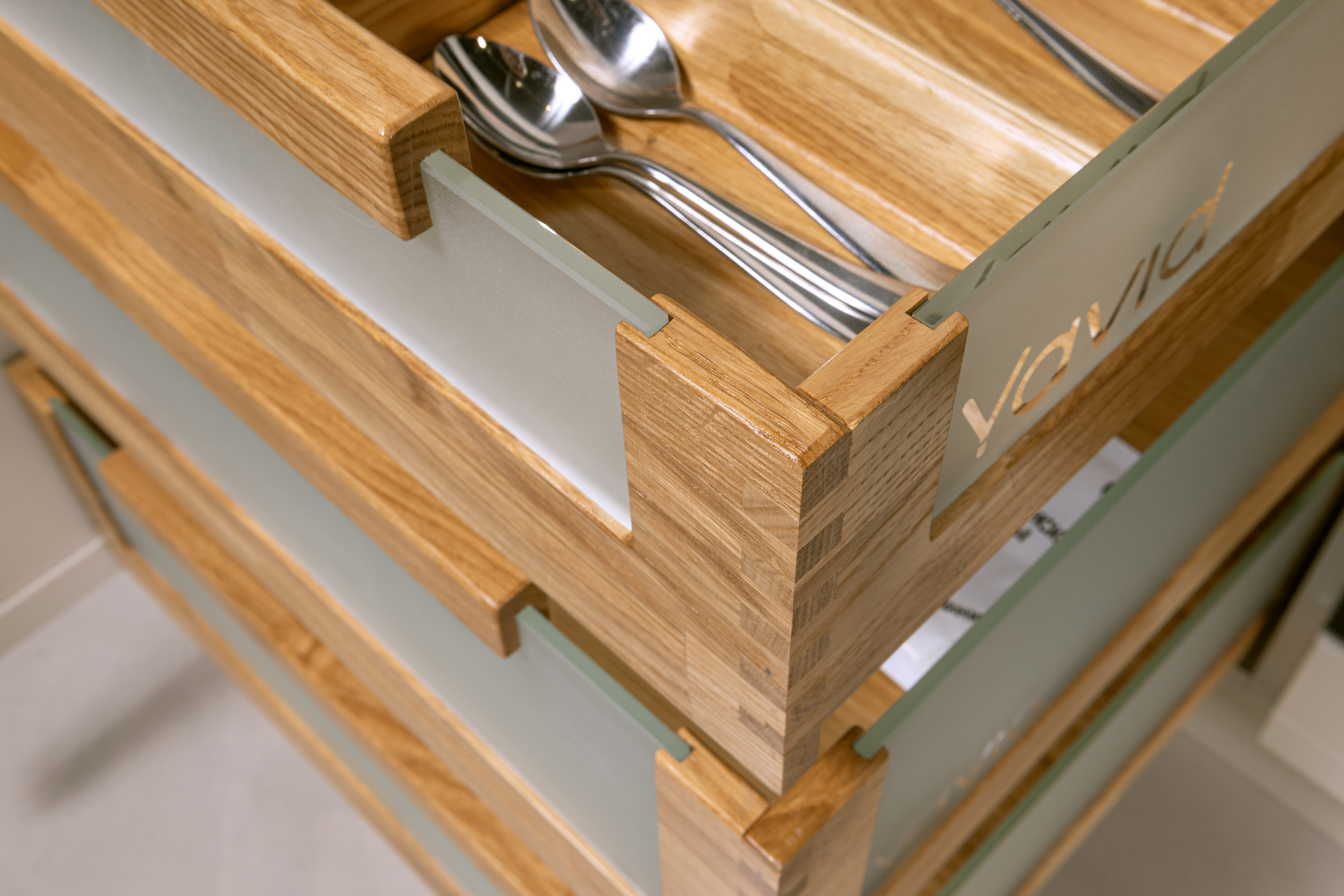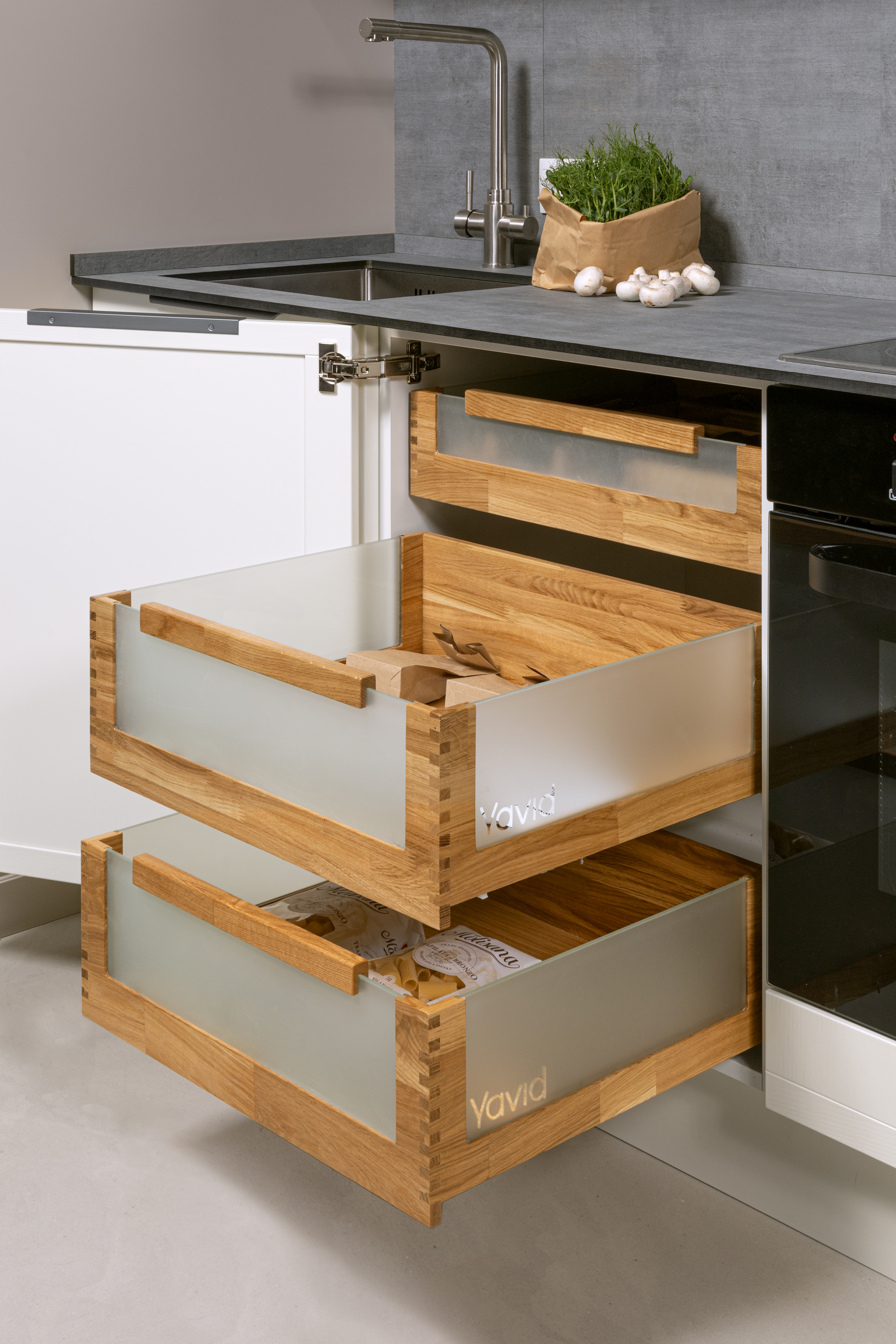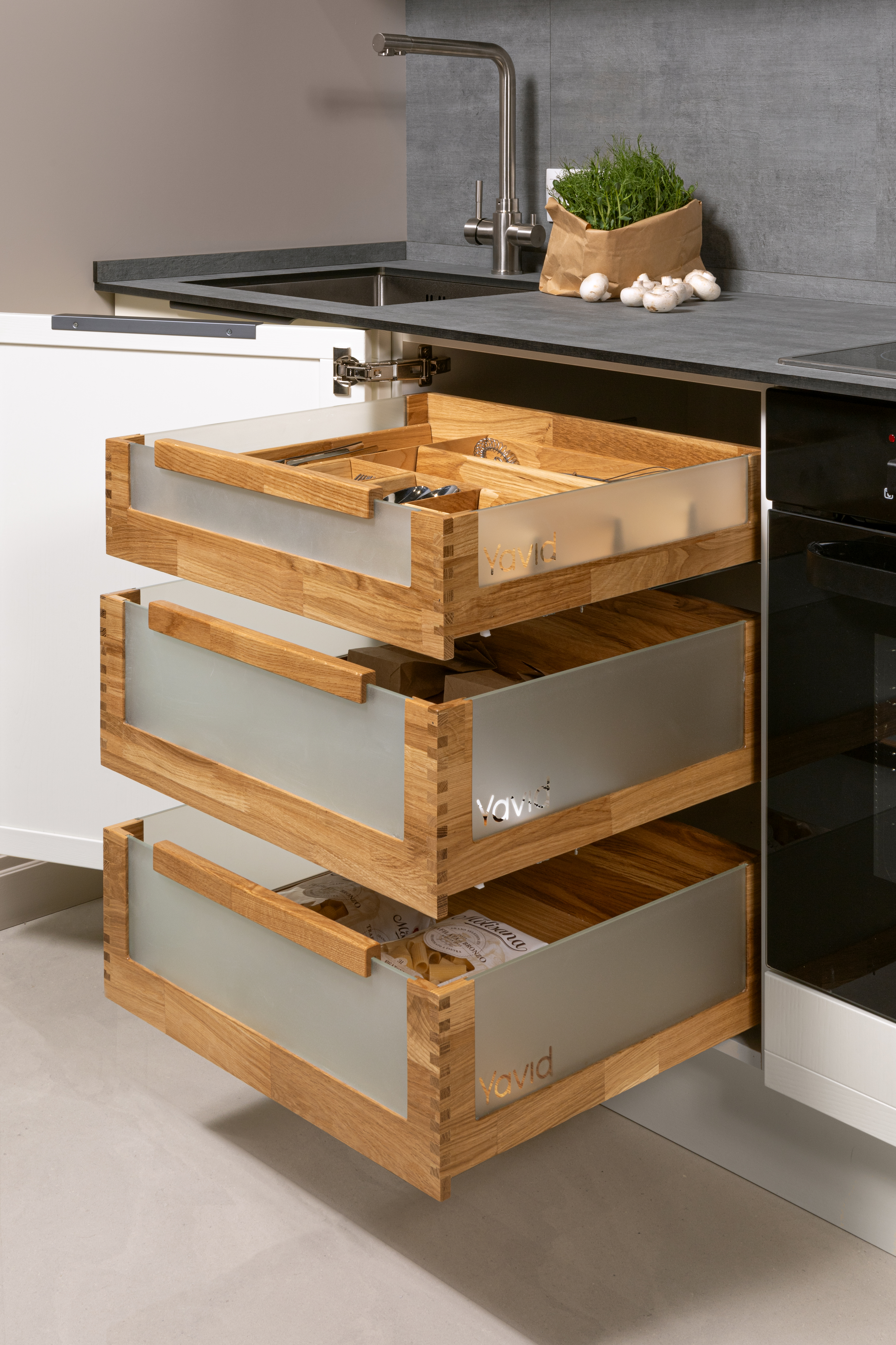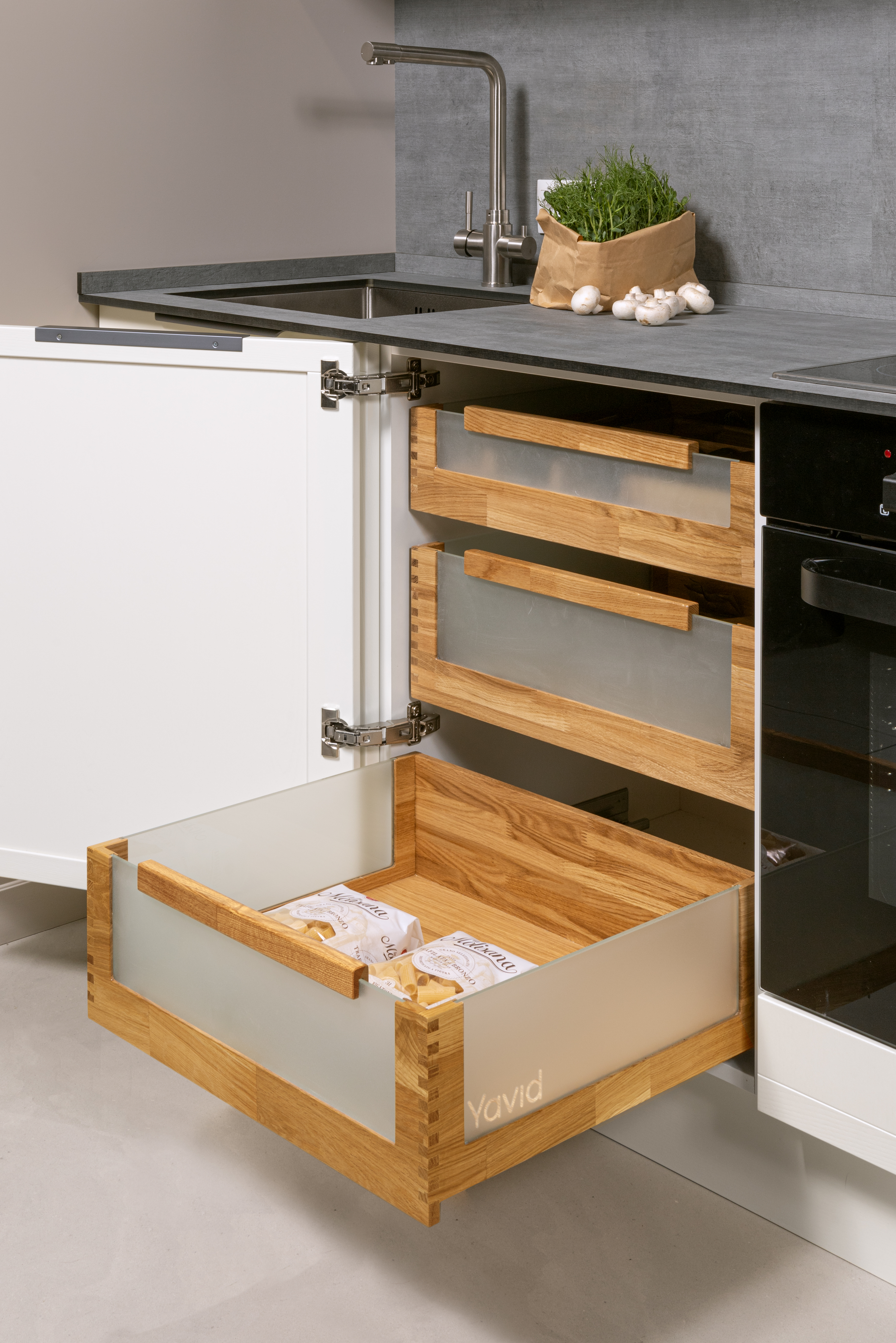 Помимо классических вариантов изготовления каркаса из ДСП, облицованной шпоном дуба, и ДСП, облицованной ламинатом, фабрика "ЯВИД" предлагает уникальную возможность - изготовить каркасы кухни "MONA" из массива сосны, облицованной шпоном дуба.