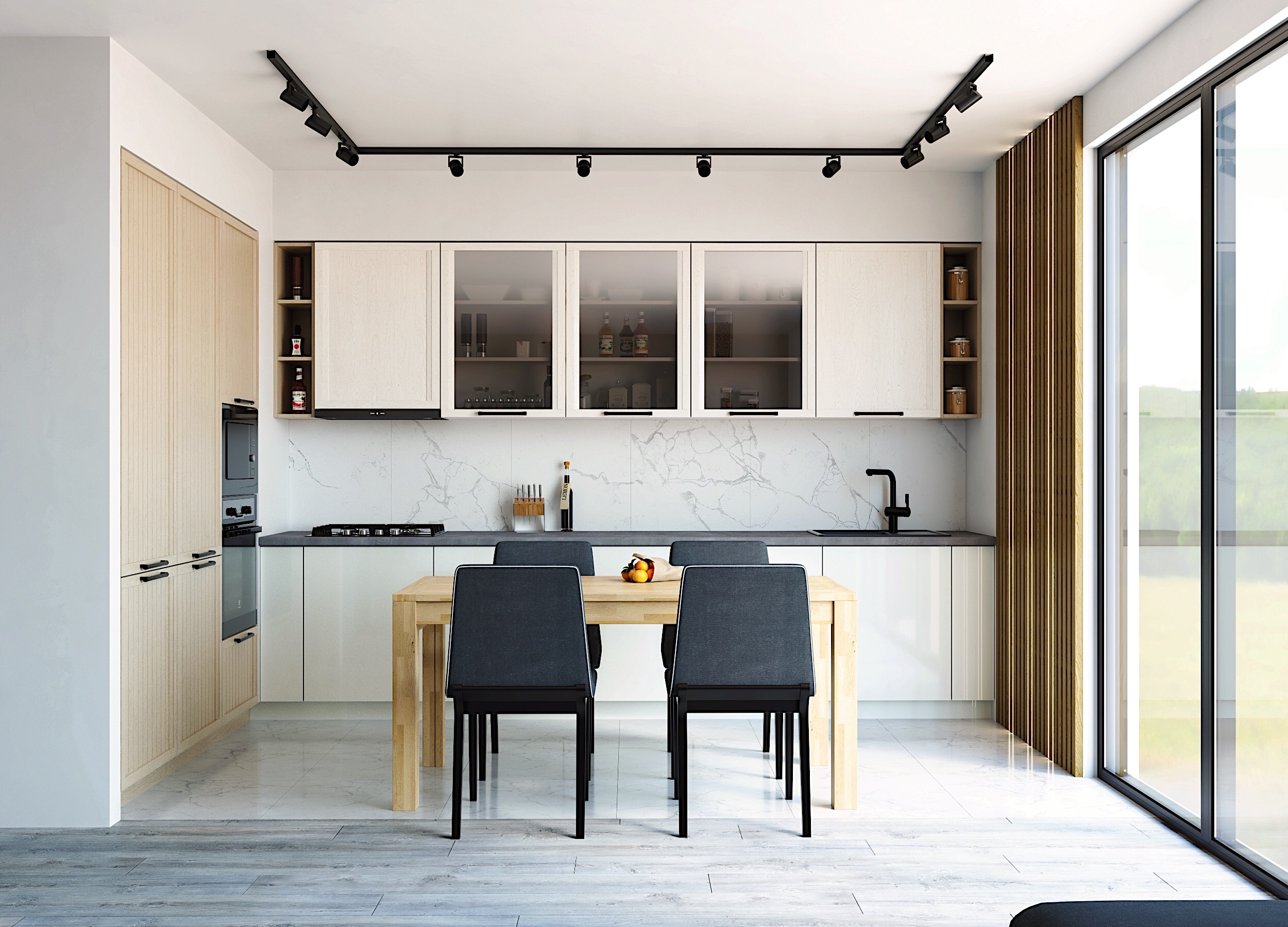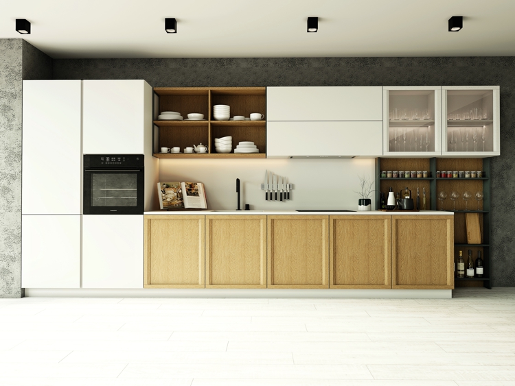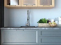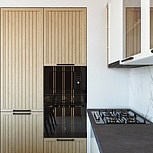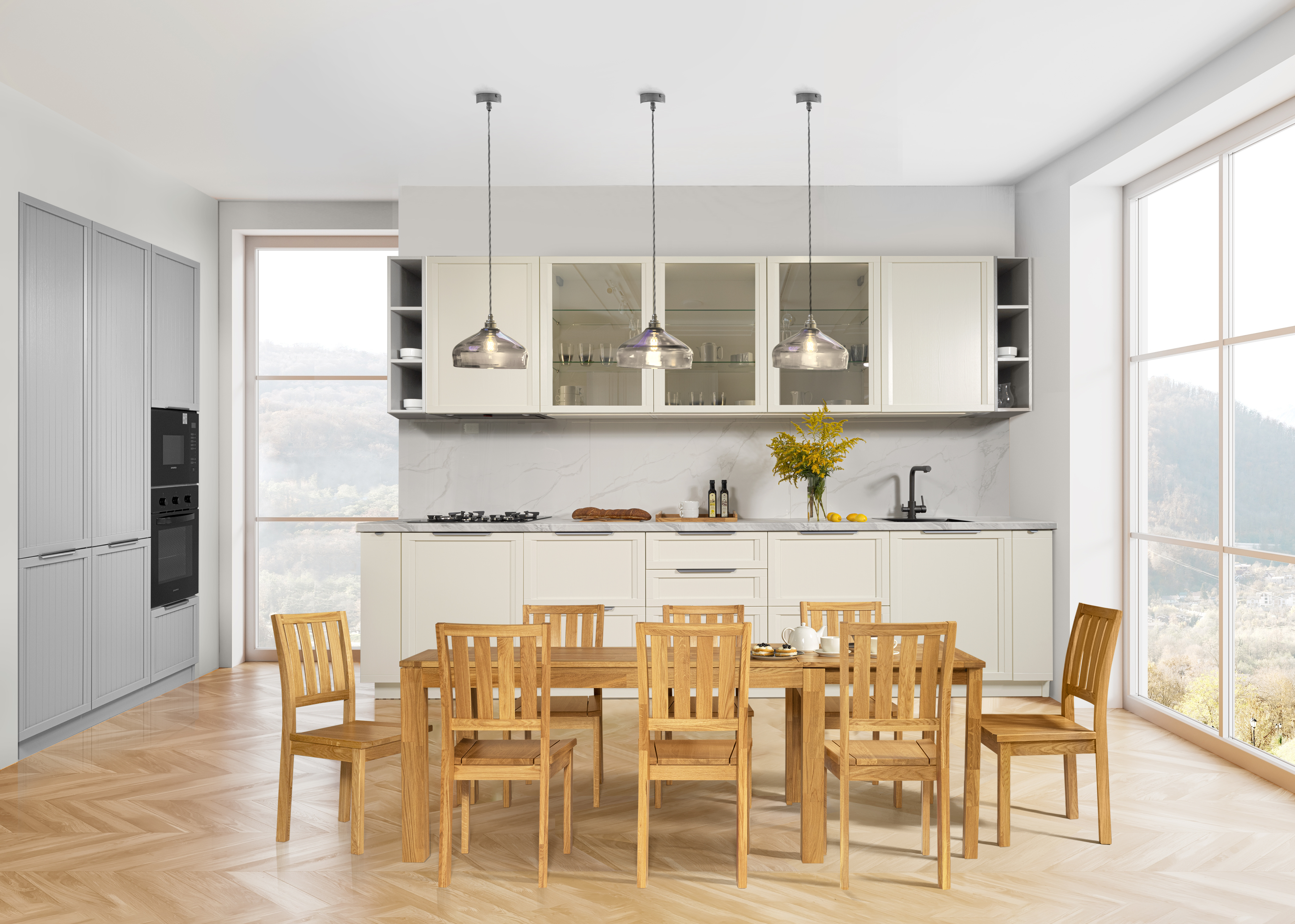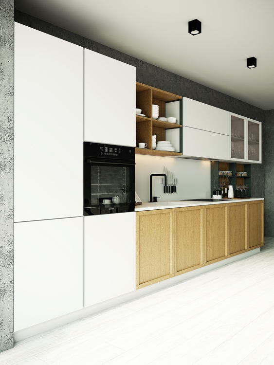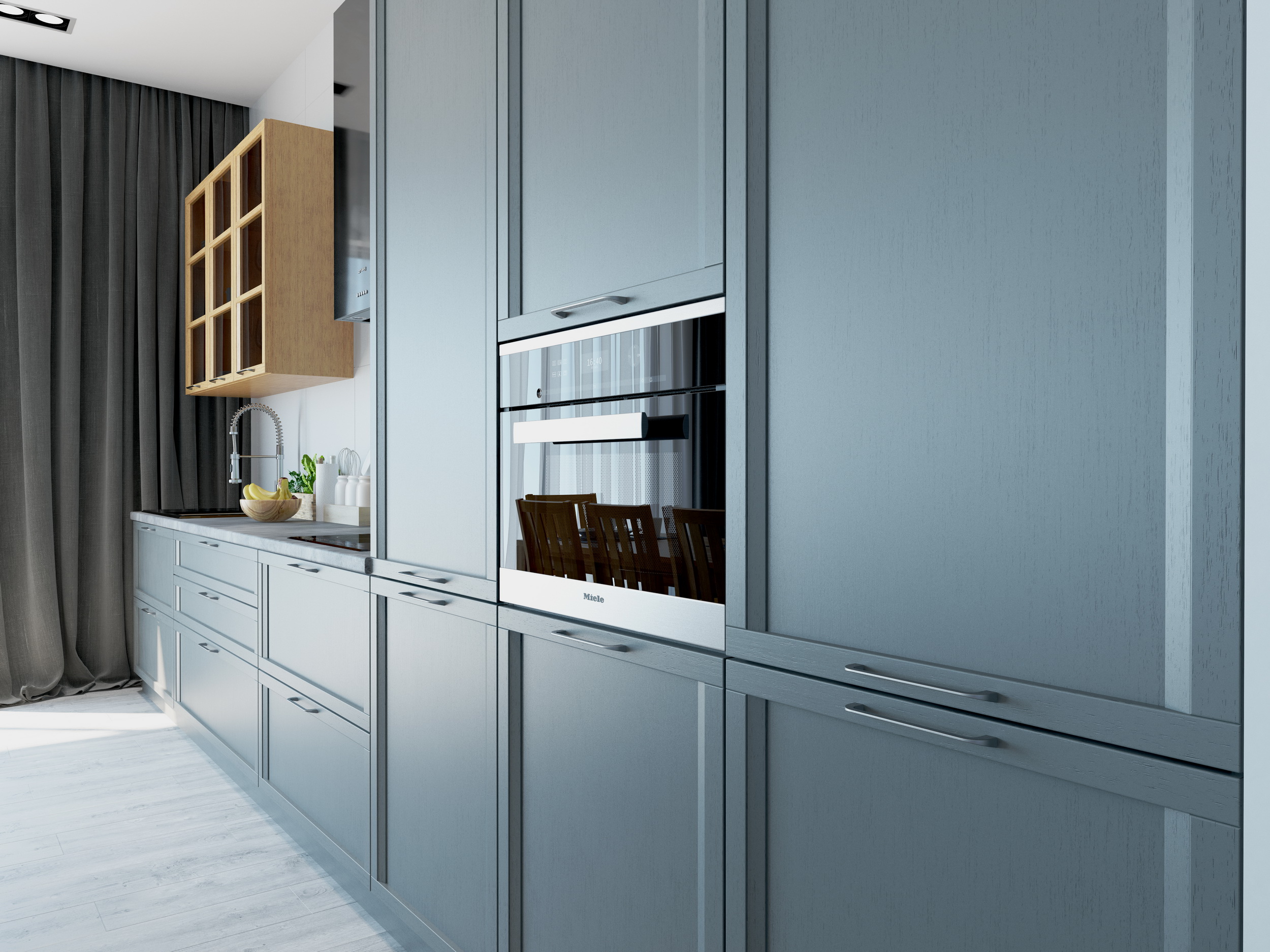 Отличительные особенности фасада кухни «MONA»: лаконичная узкая рамка и фрезеровка филенки. Это решение позволяет сместить акцент с рамки на филёнку, которая в свою очередь задаёт кухне вертикаль и динамику.