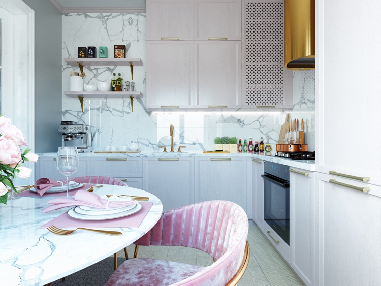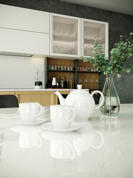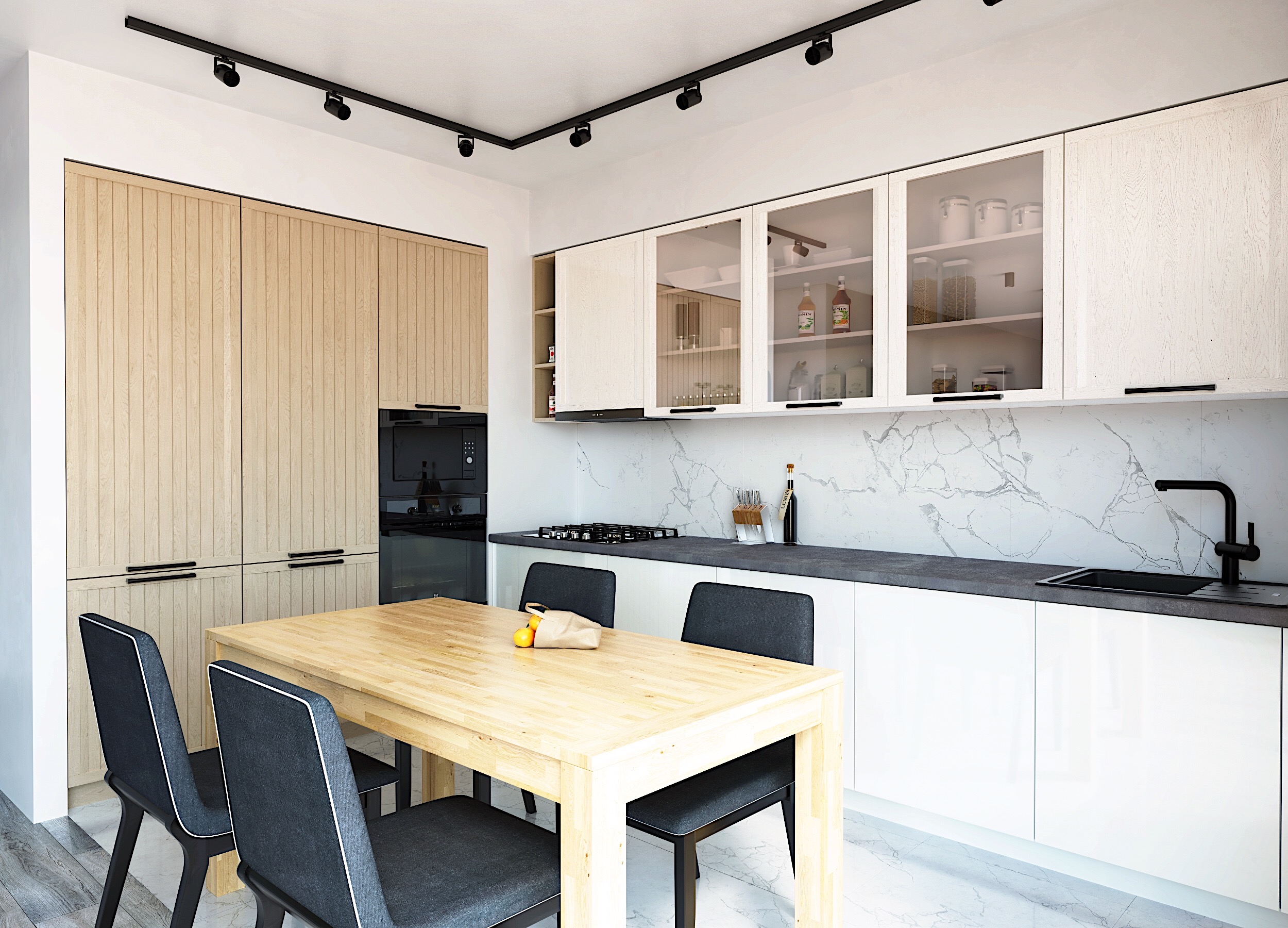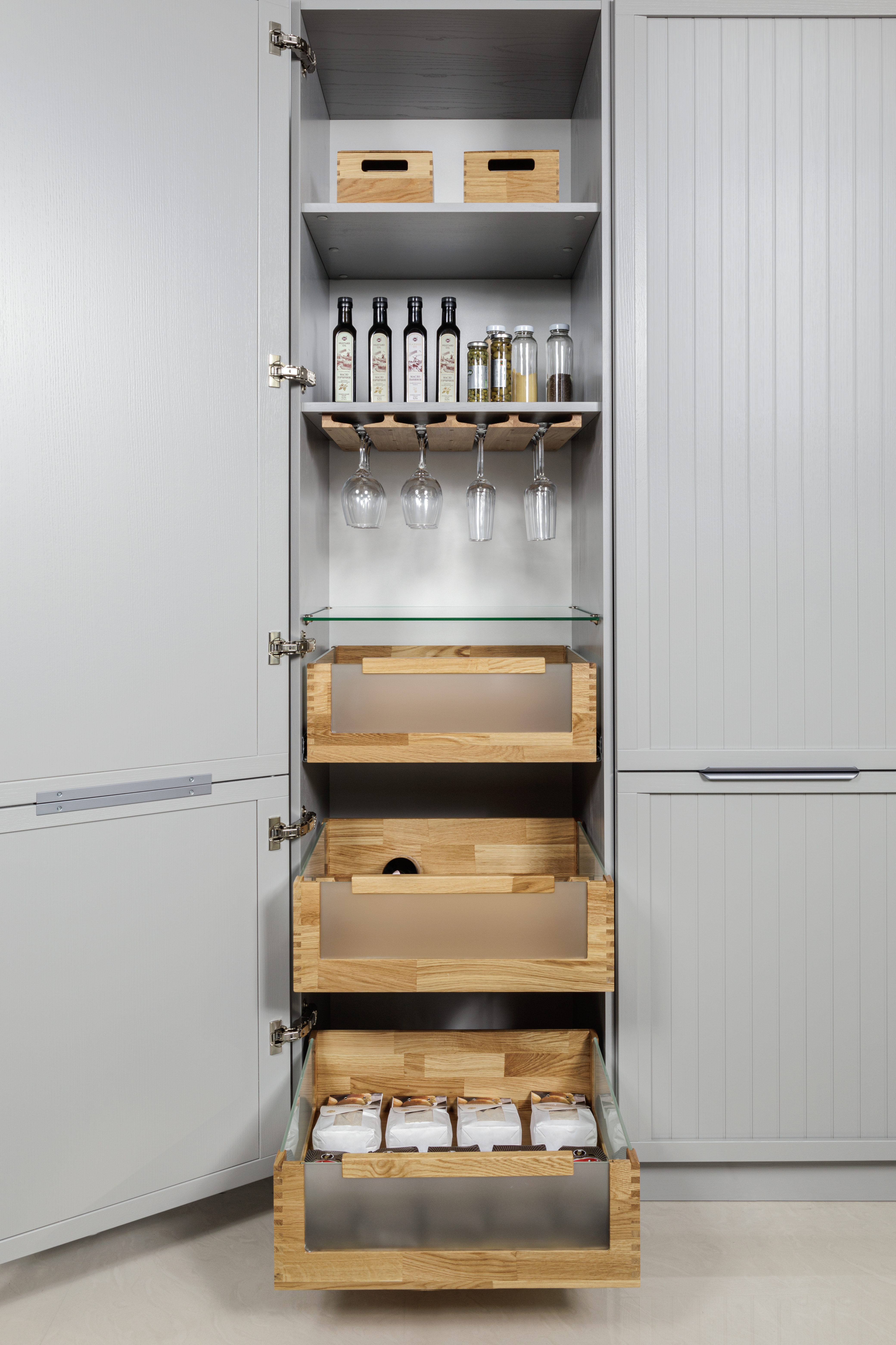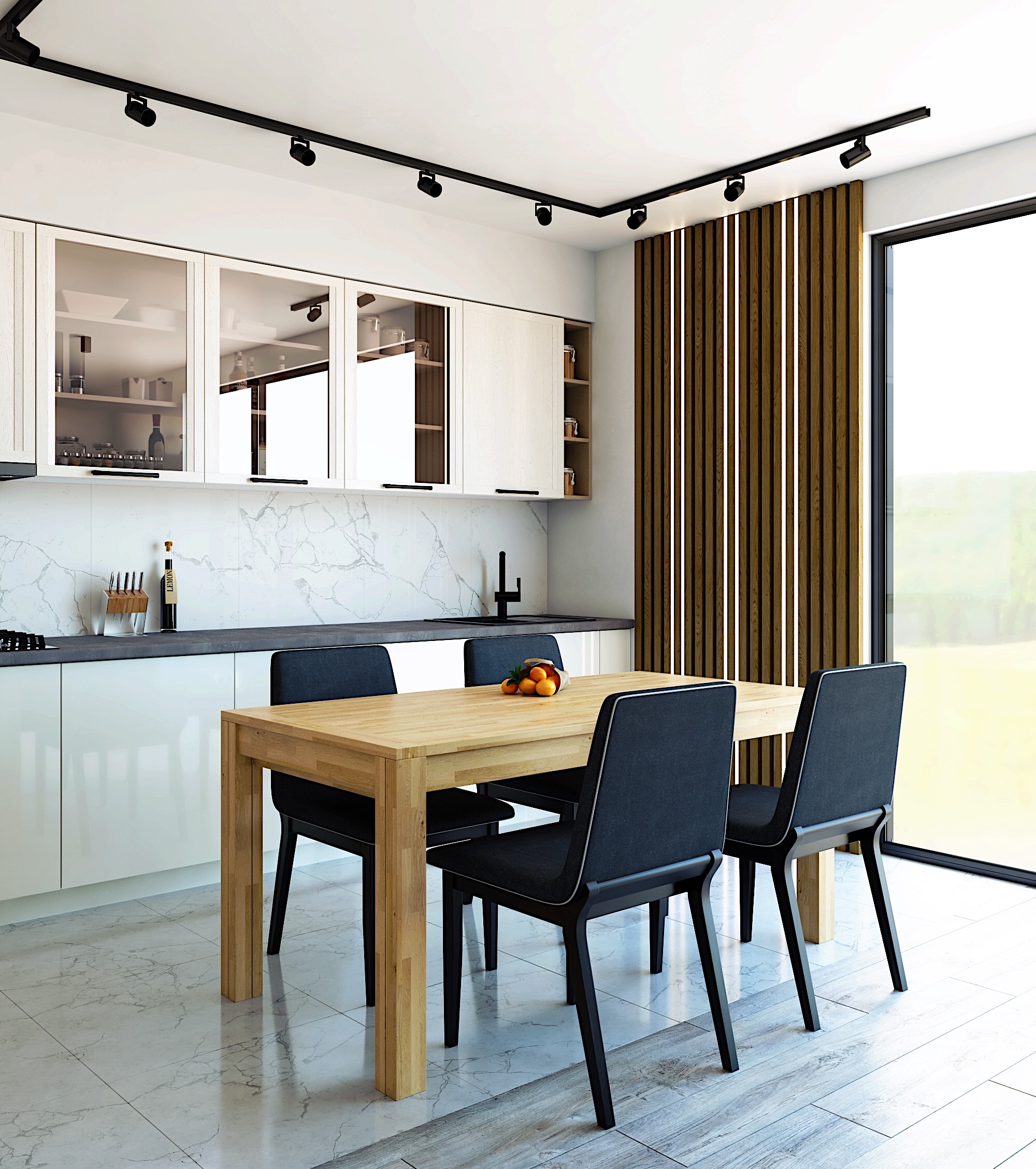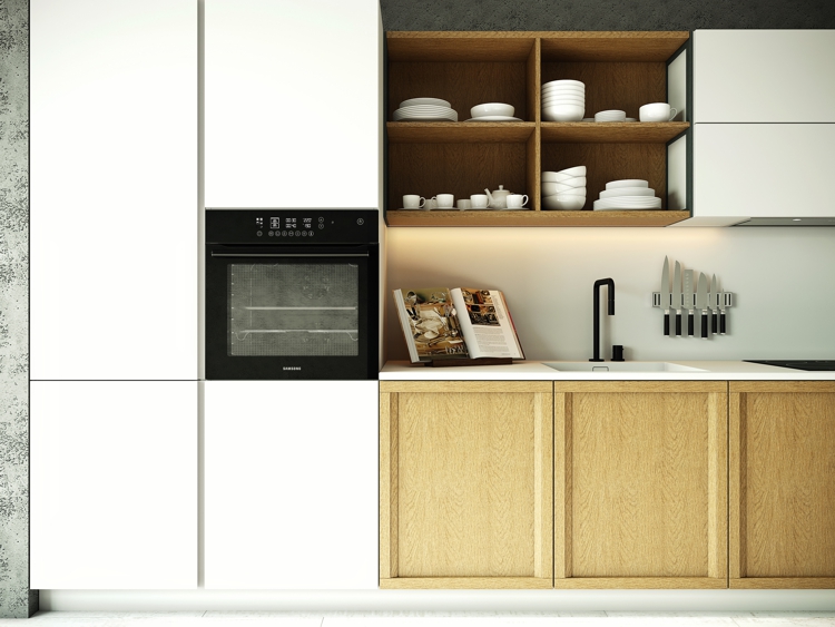 Отличительные особенности фасада кухни «MONA»: лаконичная узкая рамка и фрезеровка филенки. Это решение позволяет сместить акцент с рамки на филёнку, которая в свою очередь задаёт кухне вертикаль и динамику.