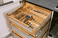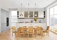 Кухня изготовлена из ценных пород древесины. Возможно различное исполнение фасадов: стандартное, с решёткой, со стеклом, с раскладкой по стеклу, с раскладкой по стандартному фасаду, с фрезеровкой по филёнке.
