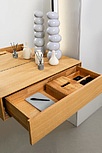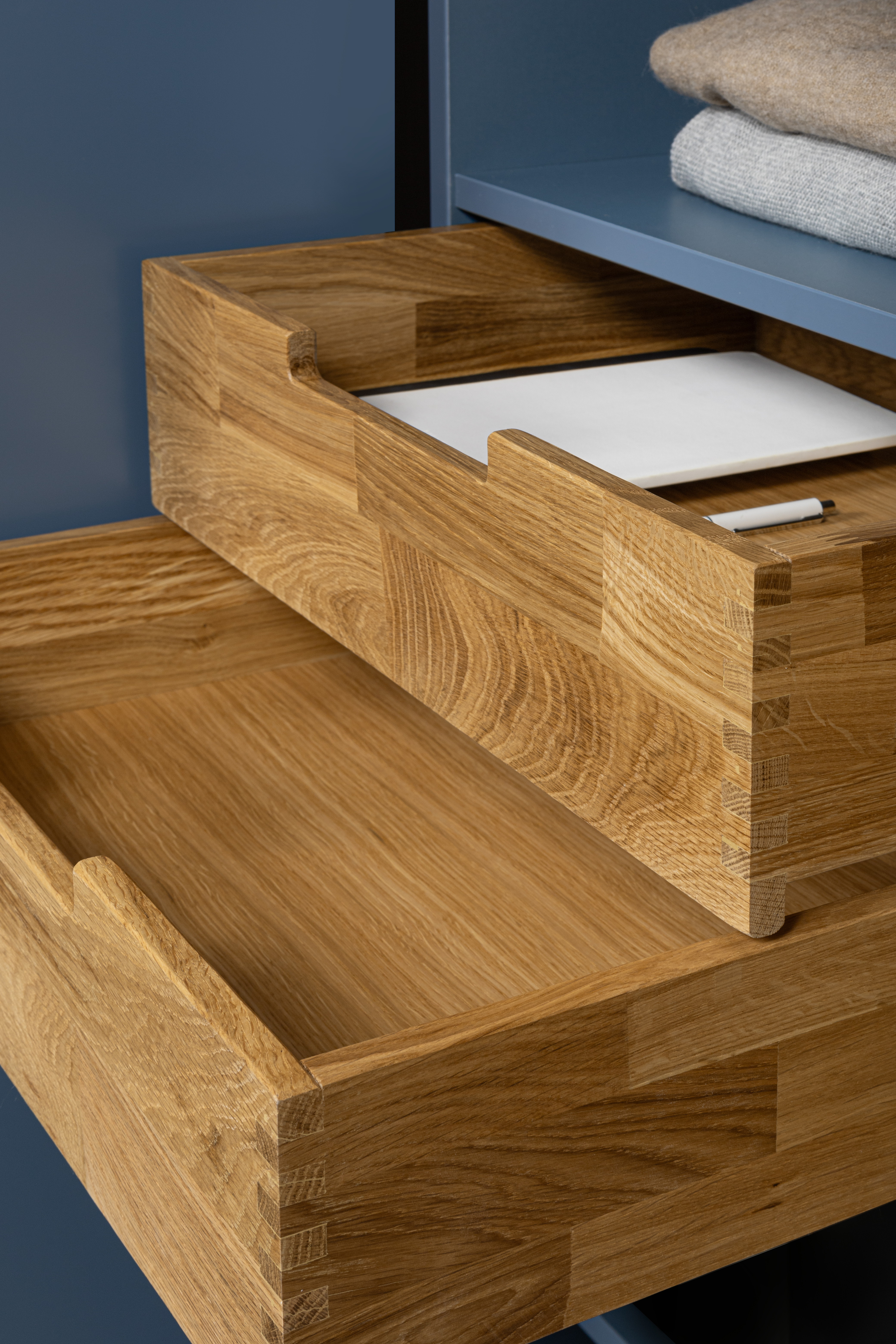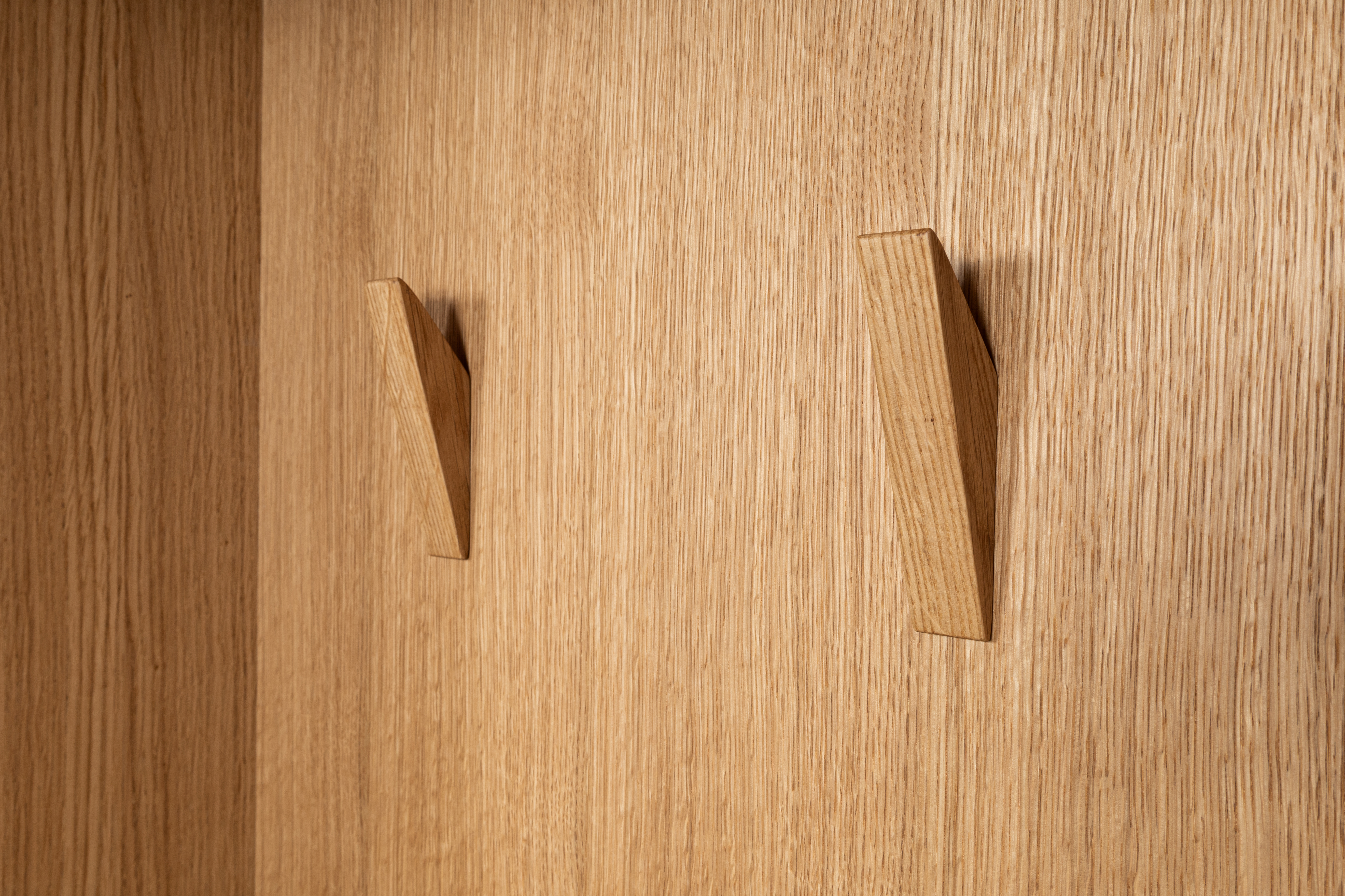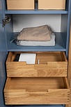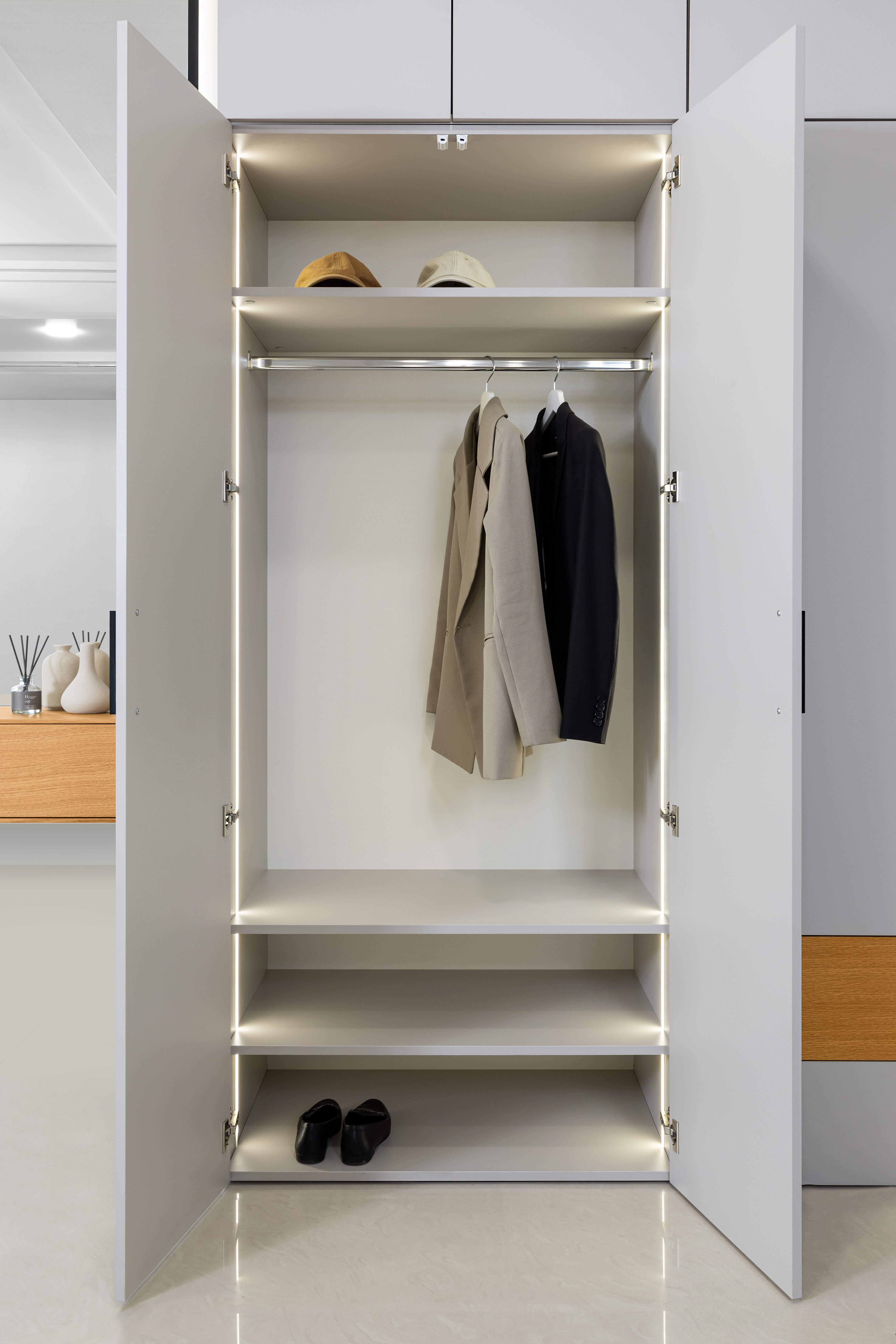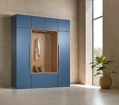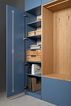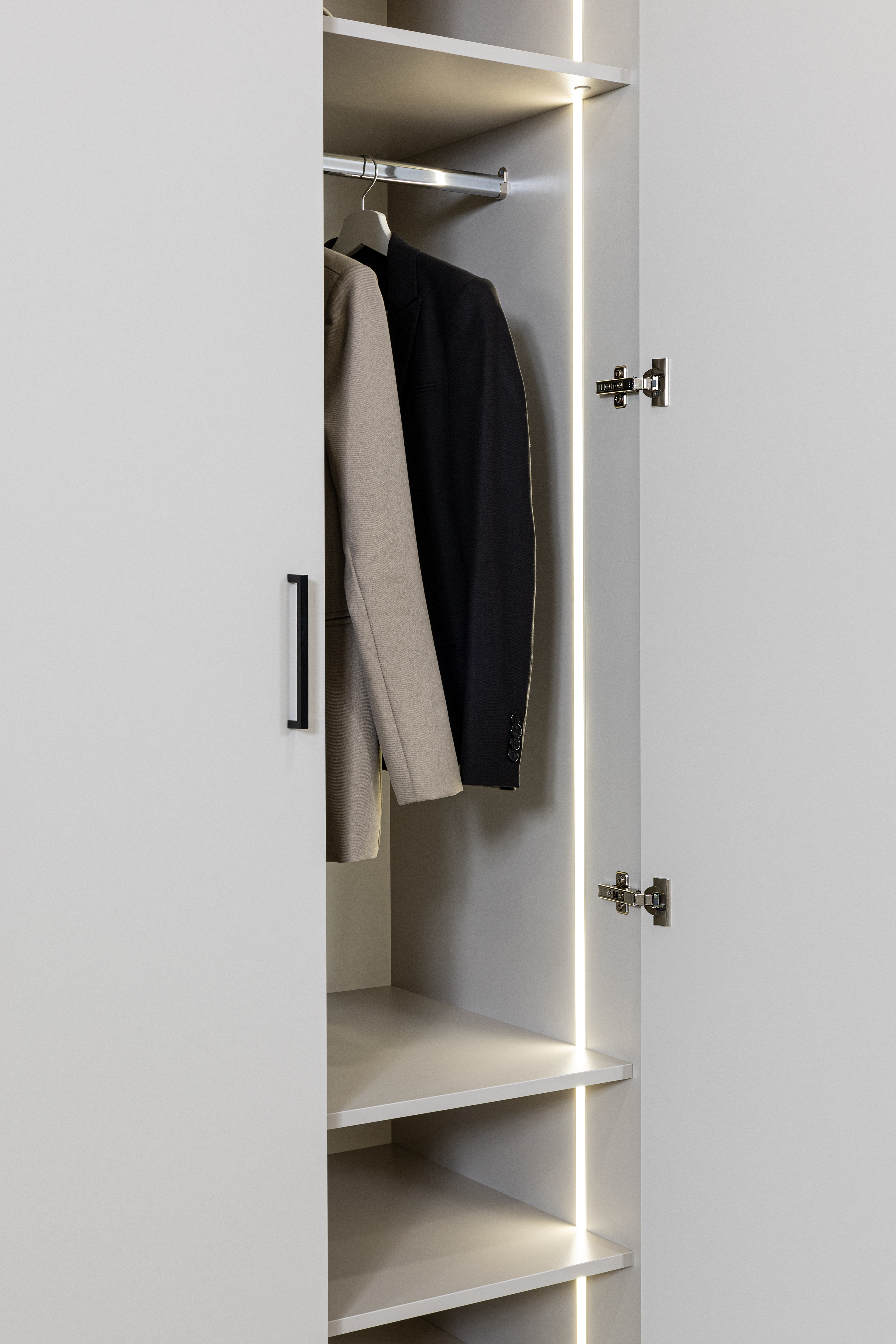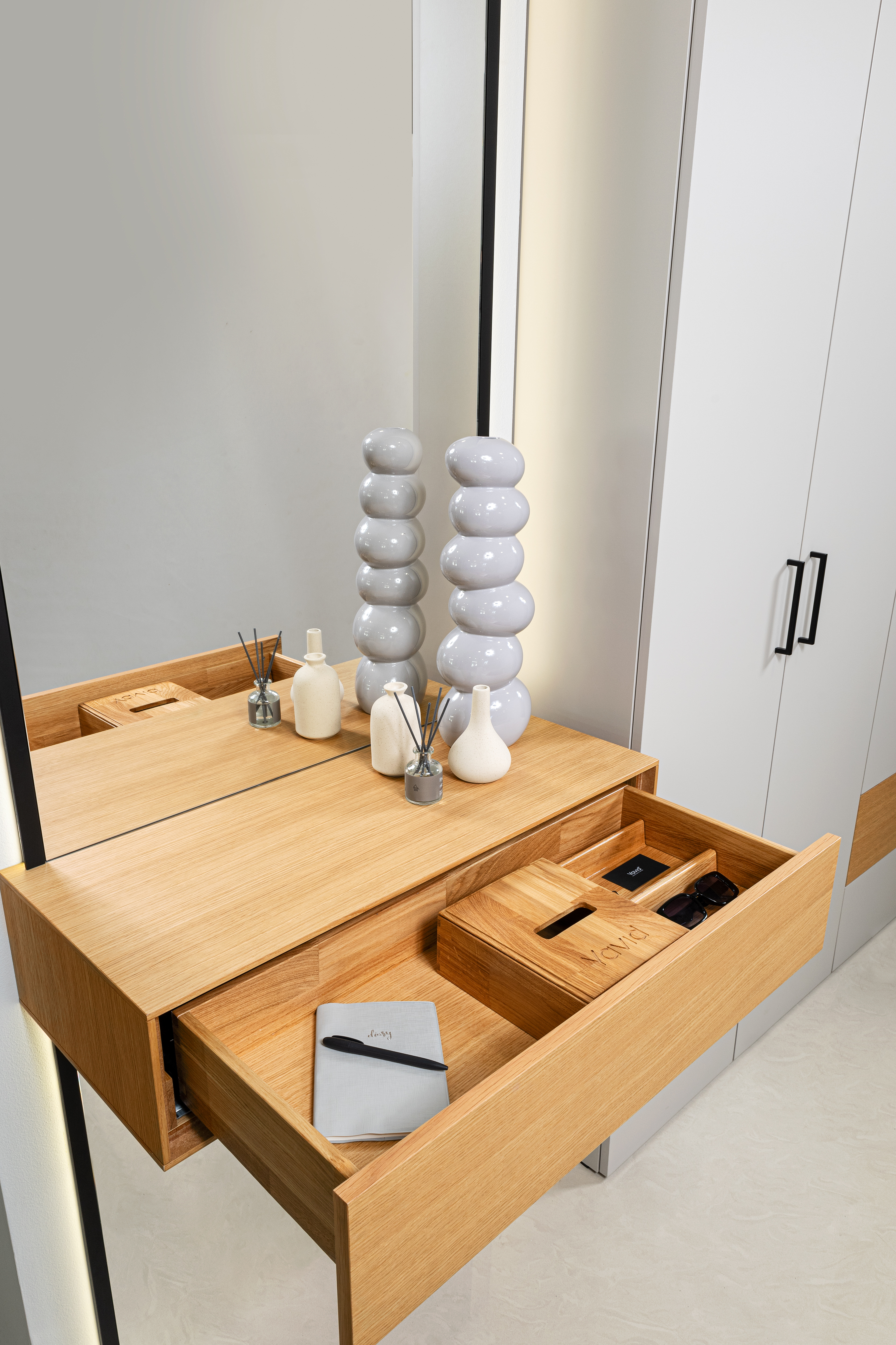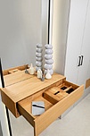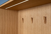 • Для нас необыкновенно важны детали. Поэтому шкафы мы оснащаем уникальными фасадами, способными распахиваться на 155 градусов, а также дубовыми ящиками, которые полностью выдвигаются. Это существенно облегчает заполнение полок или ящиков вещами. Для того чтобы хорошо видеть все содержимое, предусмотрена подсветка. А за глухим фасадом можно спрятать большое зеркало во весь рост.