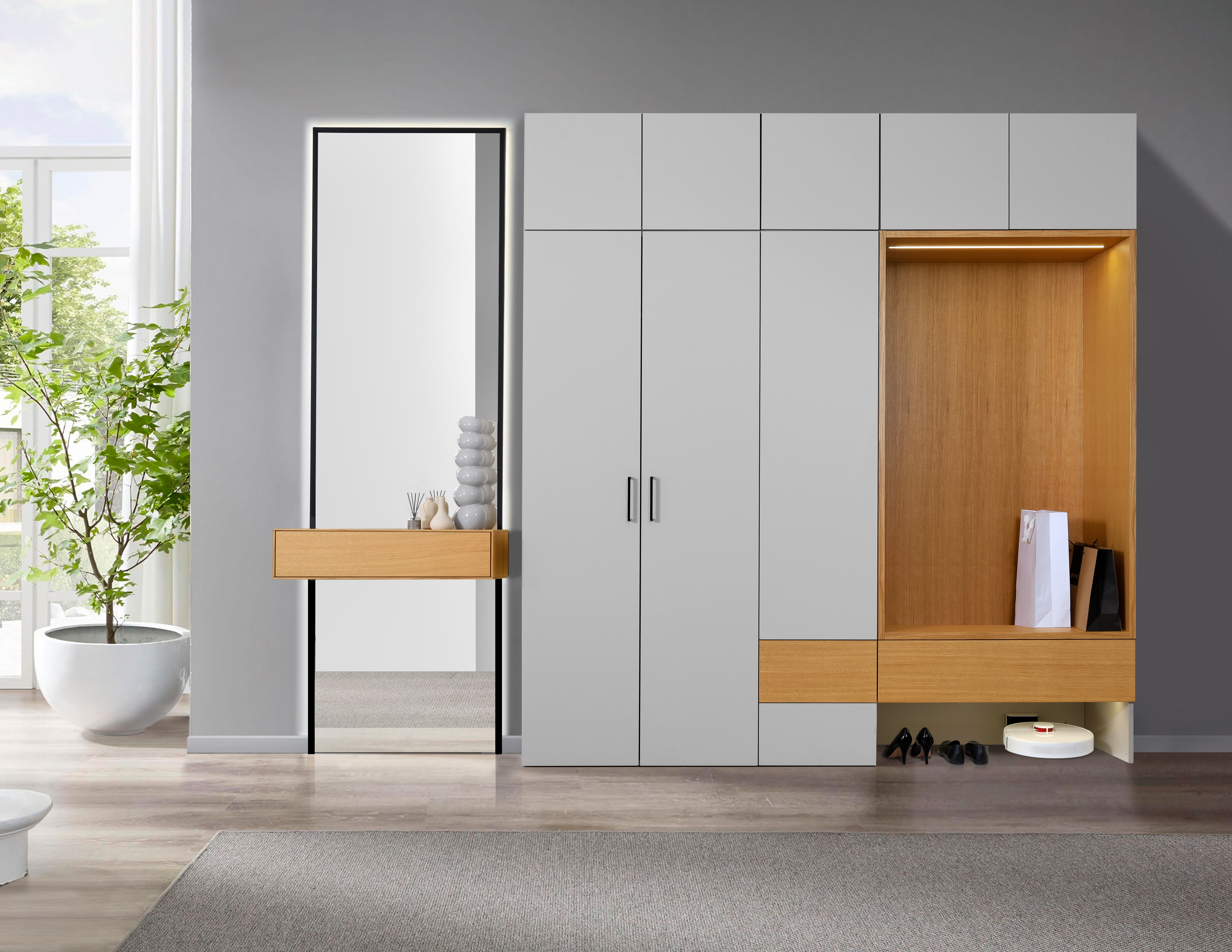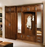 • Мебель собирается по модульной программе, что позволяет спроектировать прихожую мечты с нужным количеством предметов (обычно это шкаф, обувница, зеркало, комод).